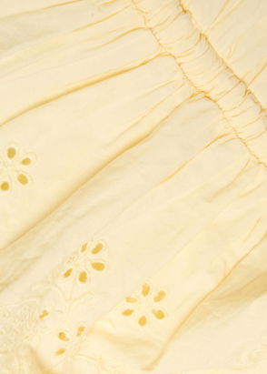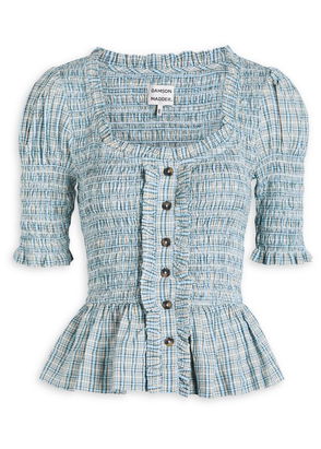 'Small and slow' London brand, Damson Madder's clothing is characterised by relaxed fits, feminine details and playful prints. Denim meets with ruffles, bows and embroidery, while cargo trousers might be rendered in an irreverent leopard print. Along with midi dresses, floral quilted jackets and oversized collar blouses, its gilets and long skirts are bestsellers.