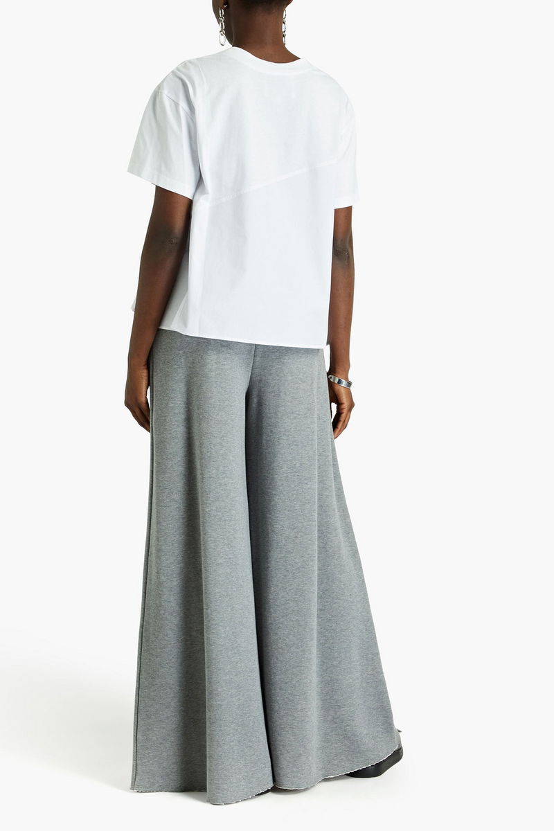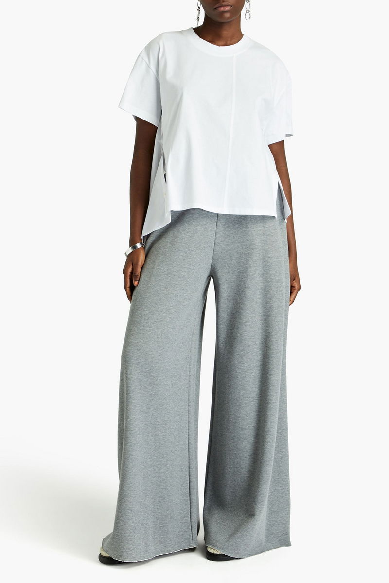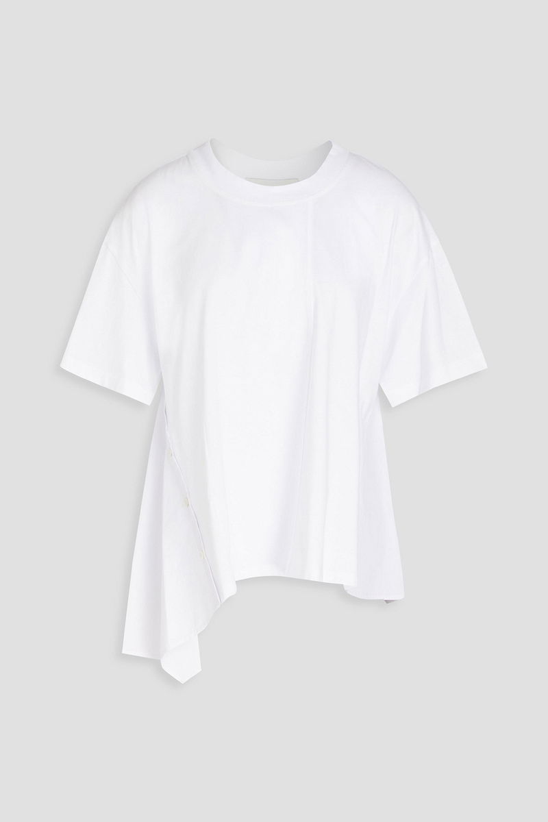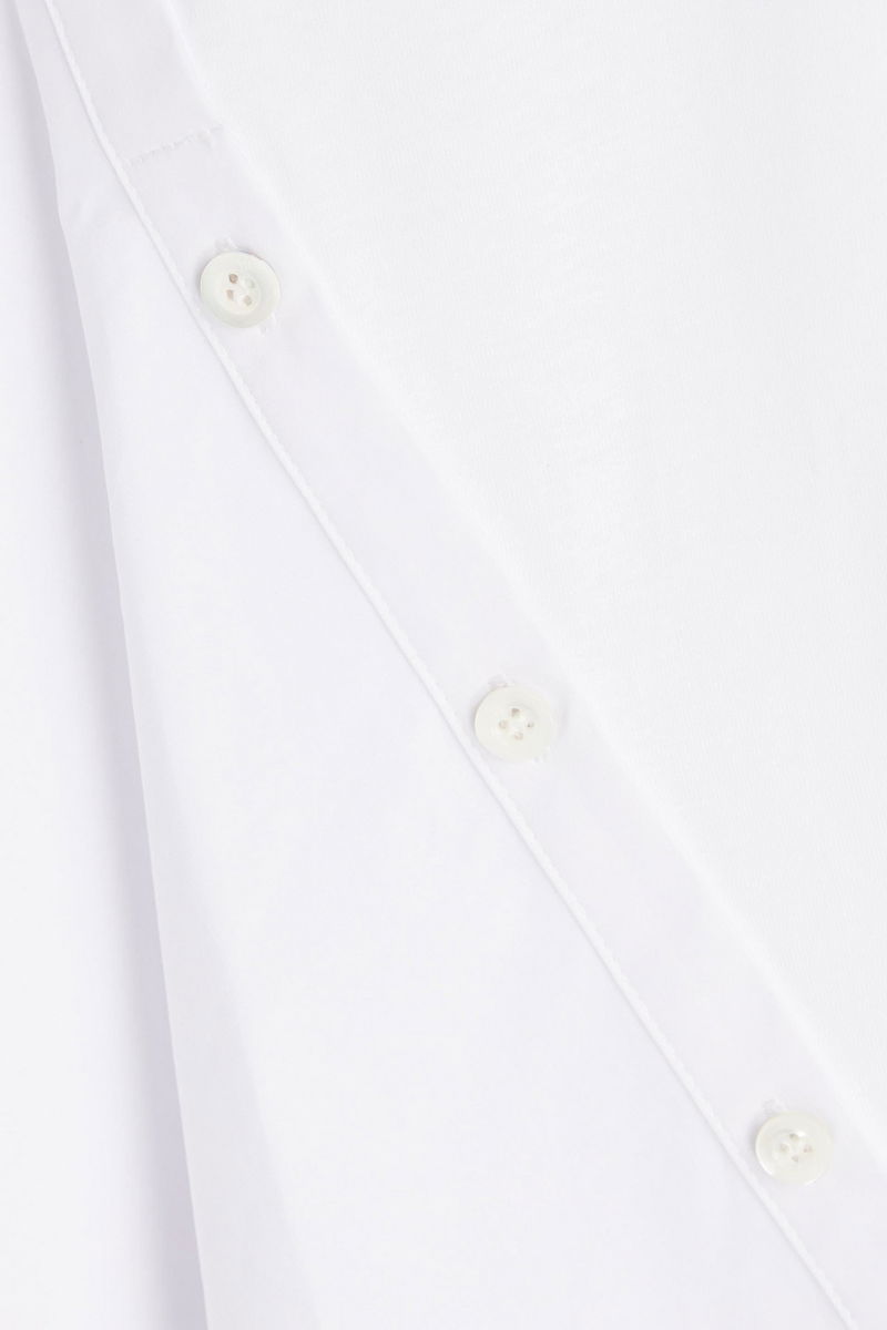 T-shirt, Cotton-jersey, Poplin, Paneled, Ribbed trims, Side slit, Button fastenings through side, Stretchy fabric with non-stretchy panels, Lightweight fabric.