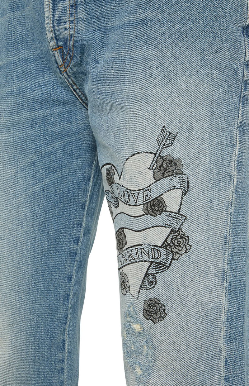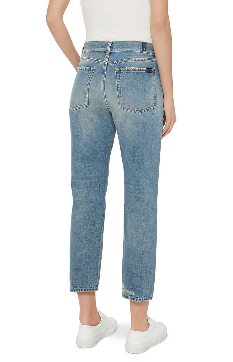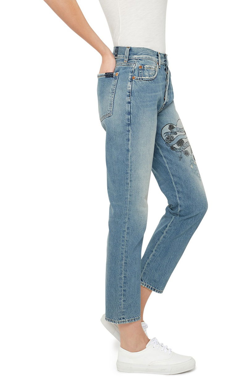 7 For All Mankind’s High Waist Josefina, in Legacy blue tattooed denim, is a skinny boyfriend fit jean with an edgy, rebellious attitude. The high waist, boyfriend fit jeans have a roomy fit through the hip and thigh and a cropped tapered leg. Legacy is a vintage inspired mid-blue denim wash finished with a ‘Love Mankind’ heart tattoo and bright copper hardware.