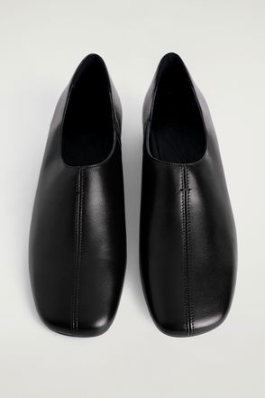 Vegetable-tanned buffed leather slip-on loafers in black. · Leather strap with rivet detailing at vamp· Molded suede footbed· Cork midsole· Treaded rubber outsole.