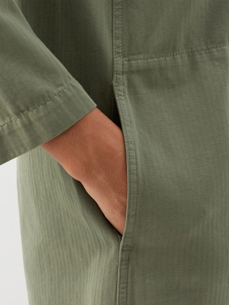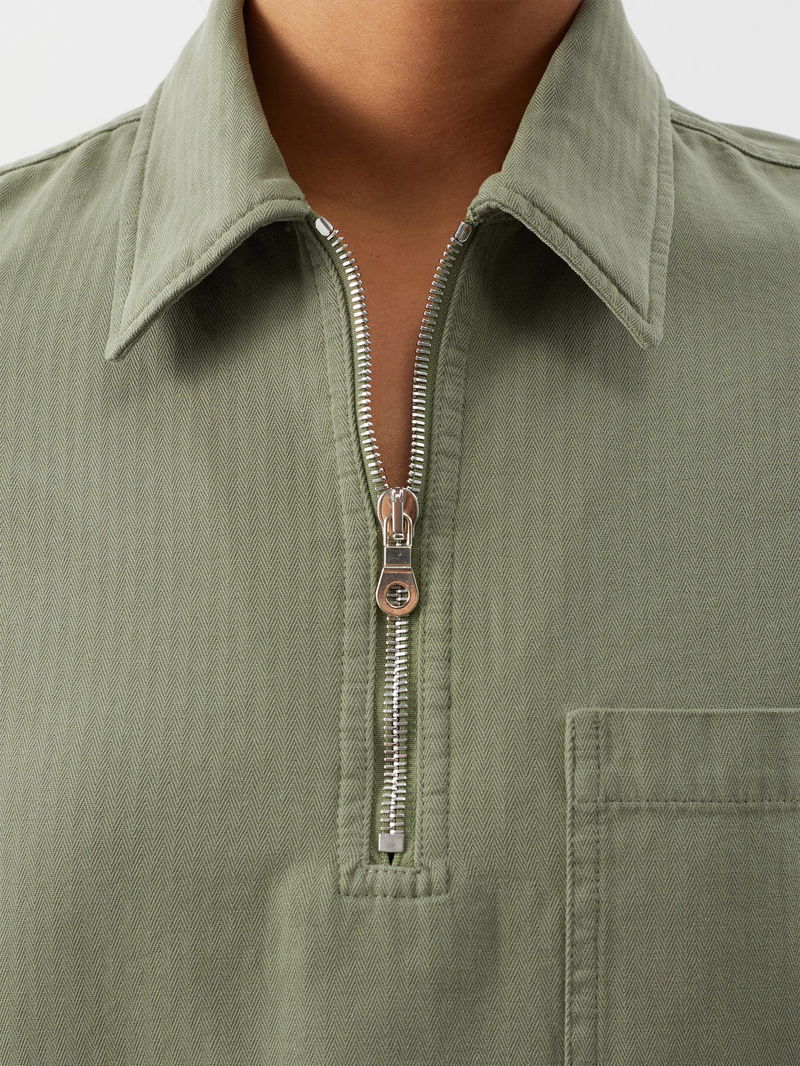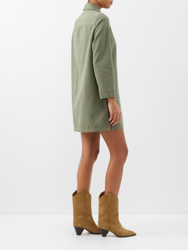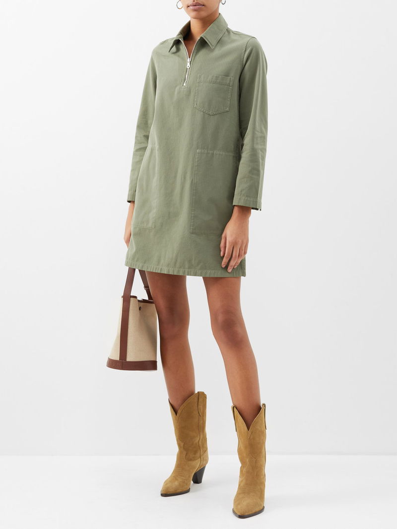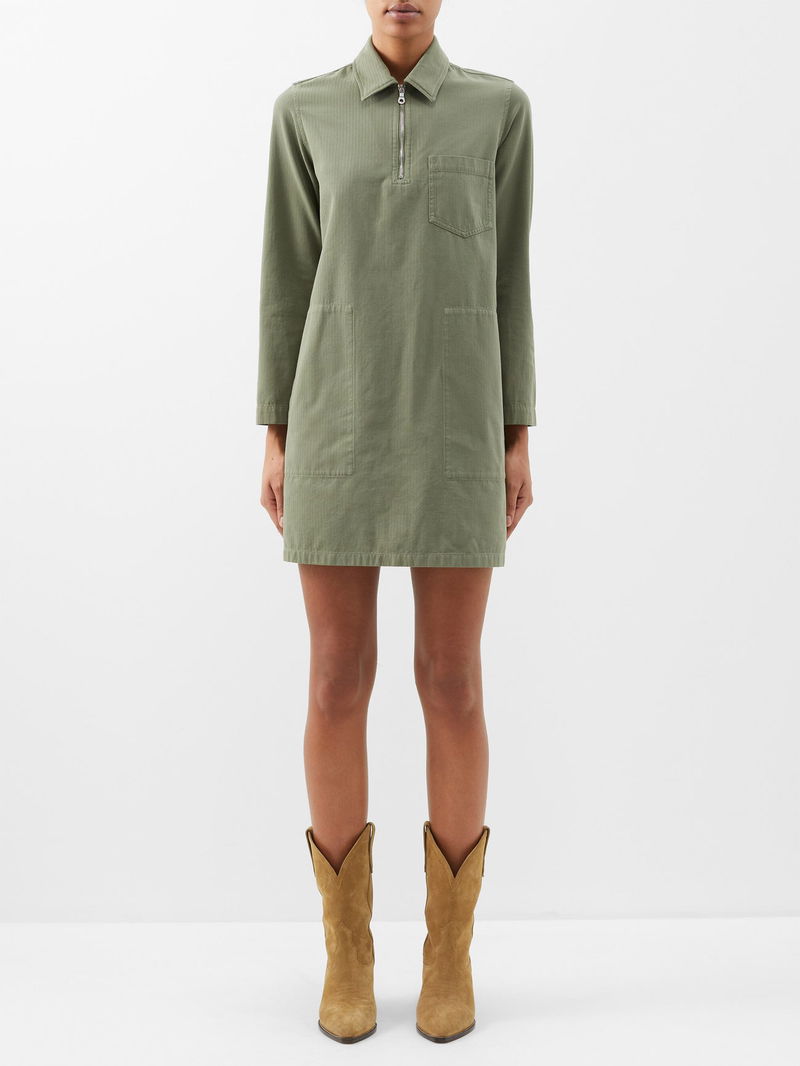 Drawing from workwear tropes, A.P.C.'s khaki-green Lauren dress in herringbone cotton is detailed with simple patch pockets and a silver-zipped neckline.