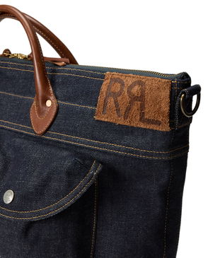 Non-stretch denim tote in indigo.· Fixed shoulder straps· Printed and embroidered logo at face· Open throat· Patch pocket at interior· Unlined.