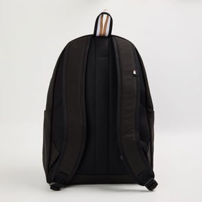 Padded nylon canvas backpack in black. Webbing trim with logo pattern printed at face. · Webbing carry handle · Adjustable padded shoulder straps · Zip pocket at face · Logo-embossed patch at back · Zip closure · Patch pocket at interior · Canvas lining.