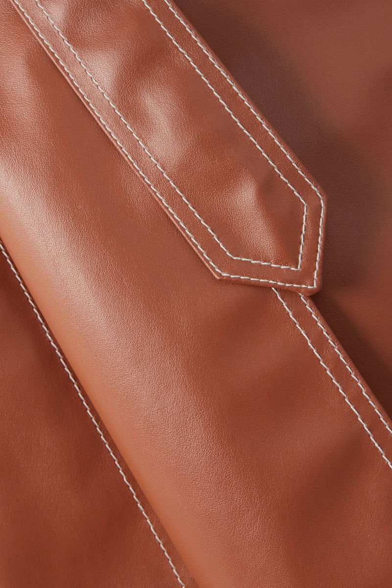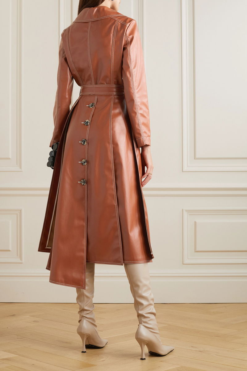 A.W.A.K.E. MODE's trench coat is made from panels of glossy faux leather and moves beautifully as you walk. It's accented with topstitching, a belt and buttons on both sides. Complement the warm brick shade with tan boots.