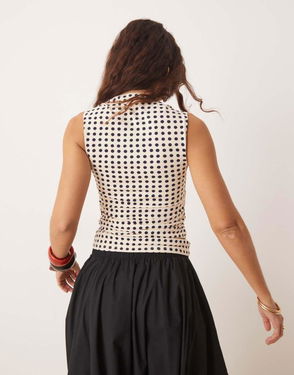 Abercrombie & Fitch Asymmetric Ruched Mesh Top In Brown Polka Dot