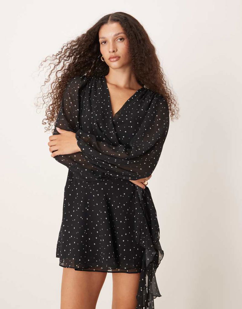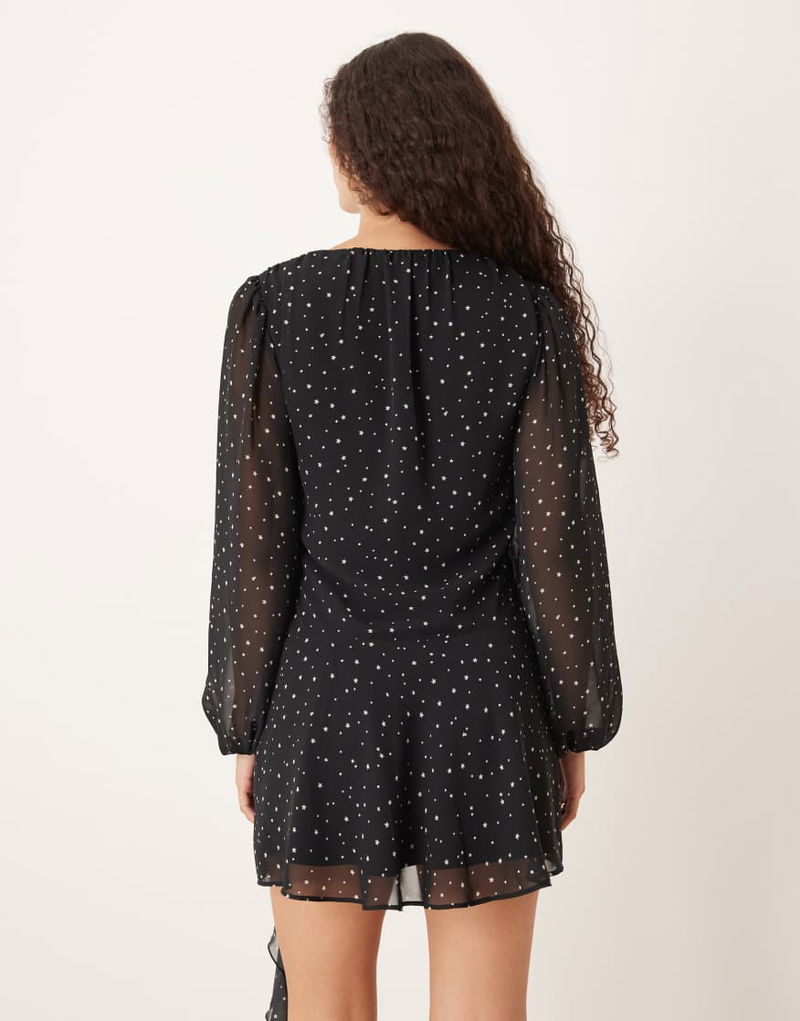 Abercrombie & Fitch Long Sleeve Plunge Neck Wrap Front Mini Dress In Black Star Print