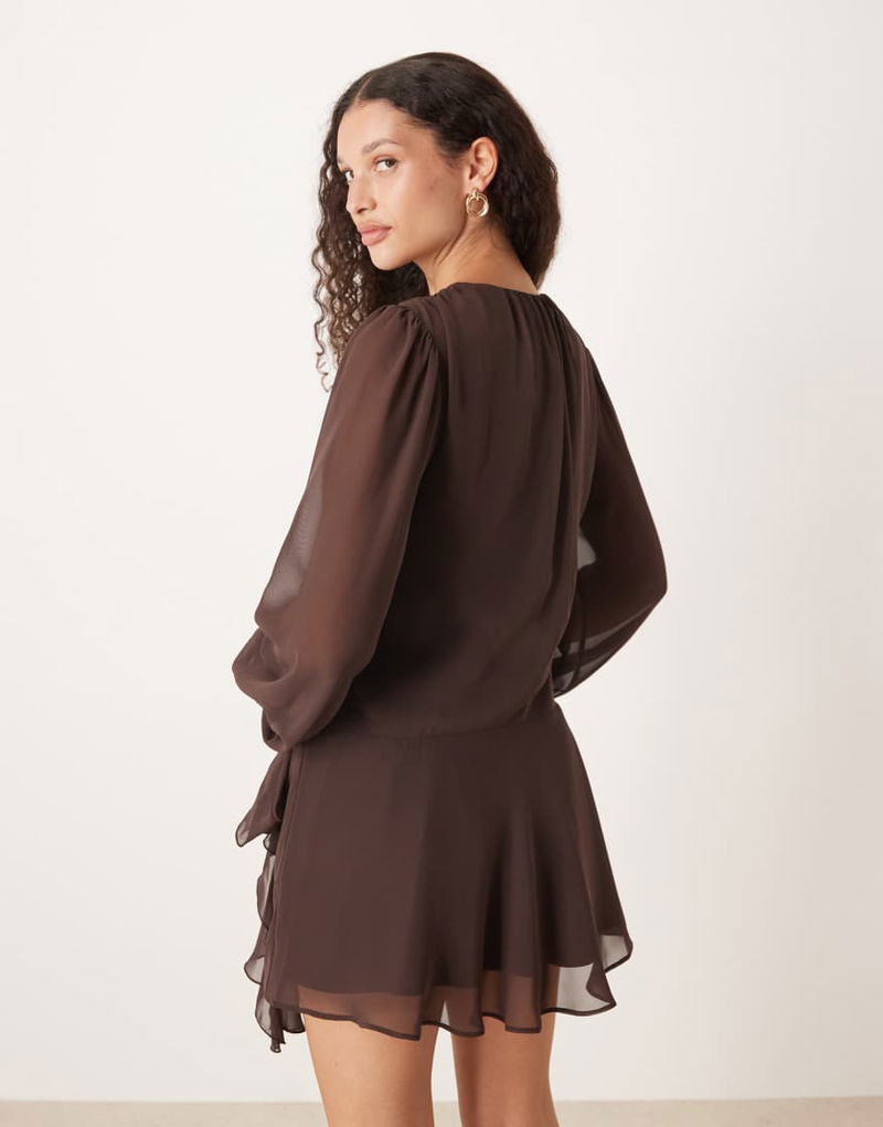 Abercrombie & Fitch Long Sleeve Plunge Neck Wrap Front Mini Dress In Brown