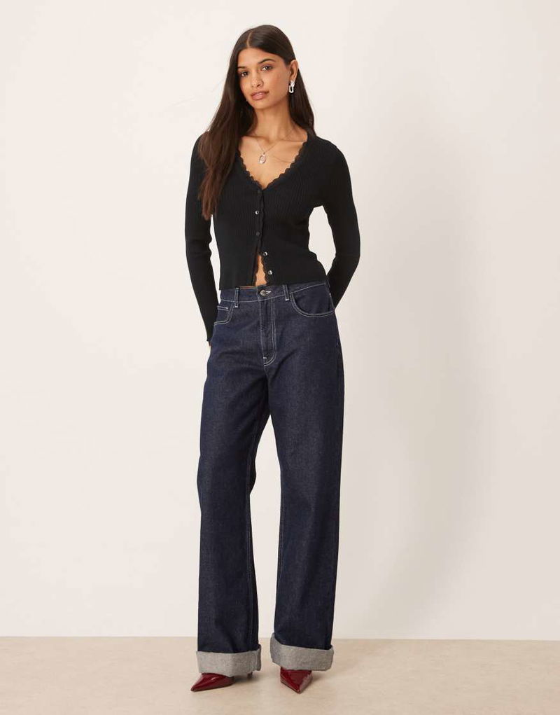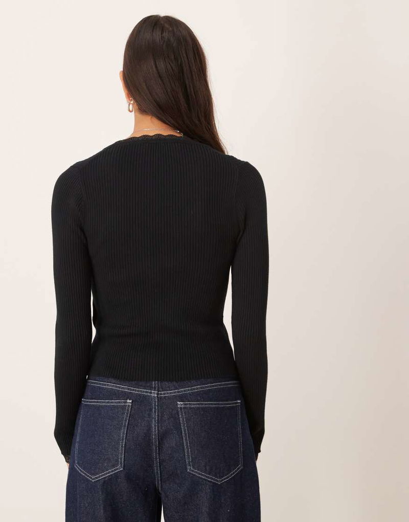 Abercrombie & Fitch Ribbed Cardigan With Lace Trim In Black