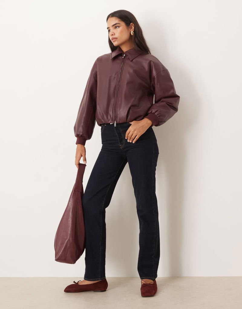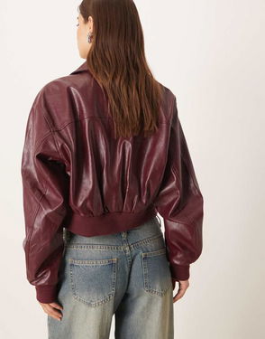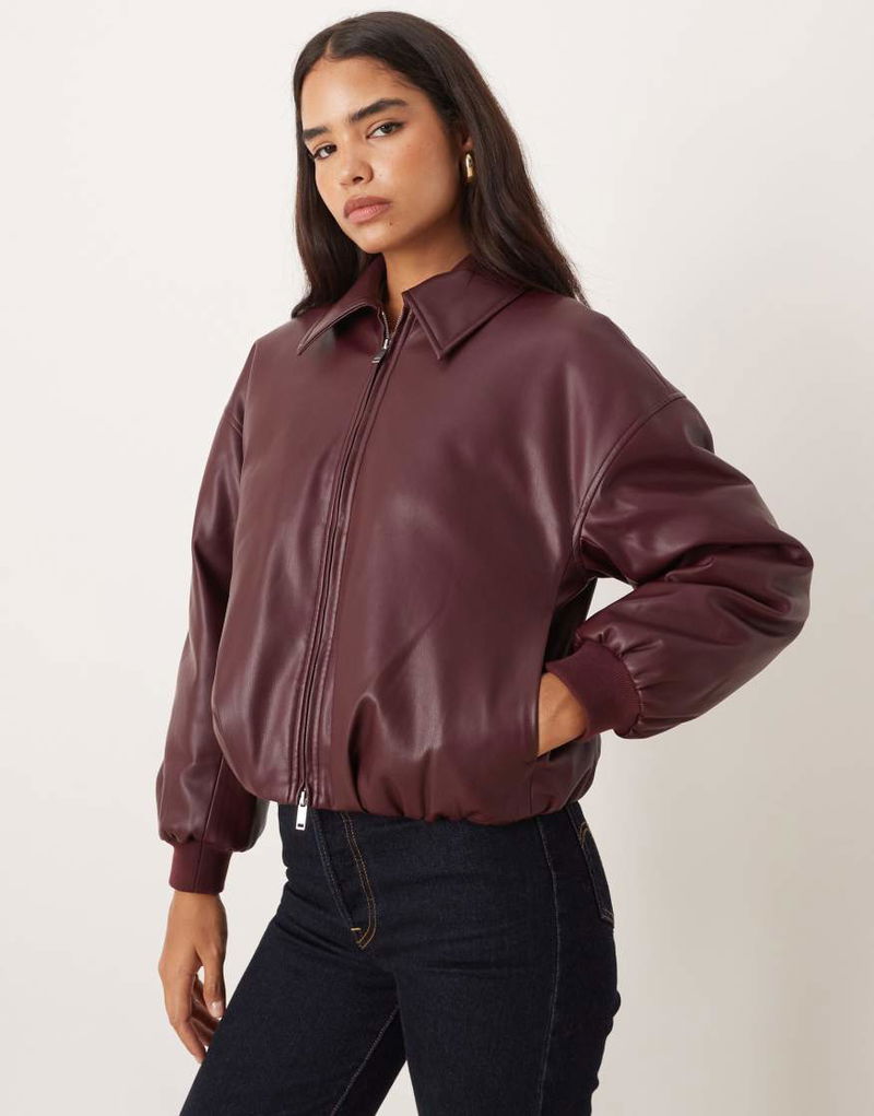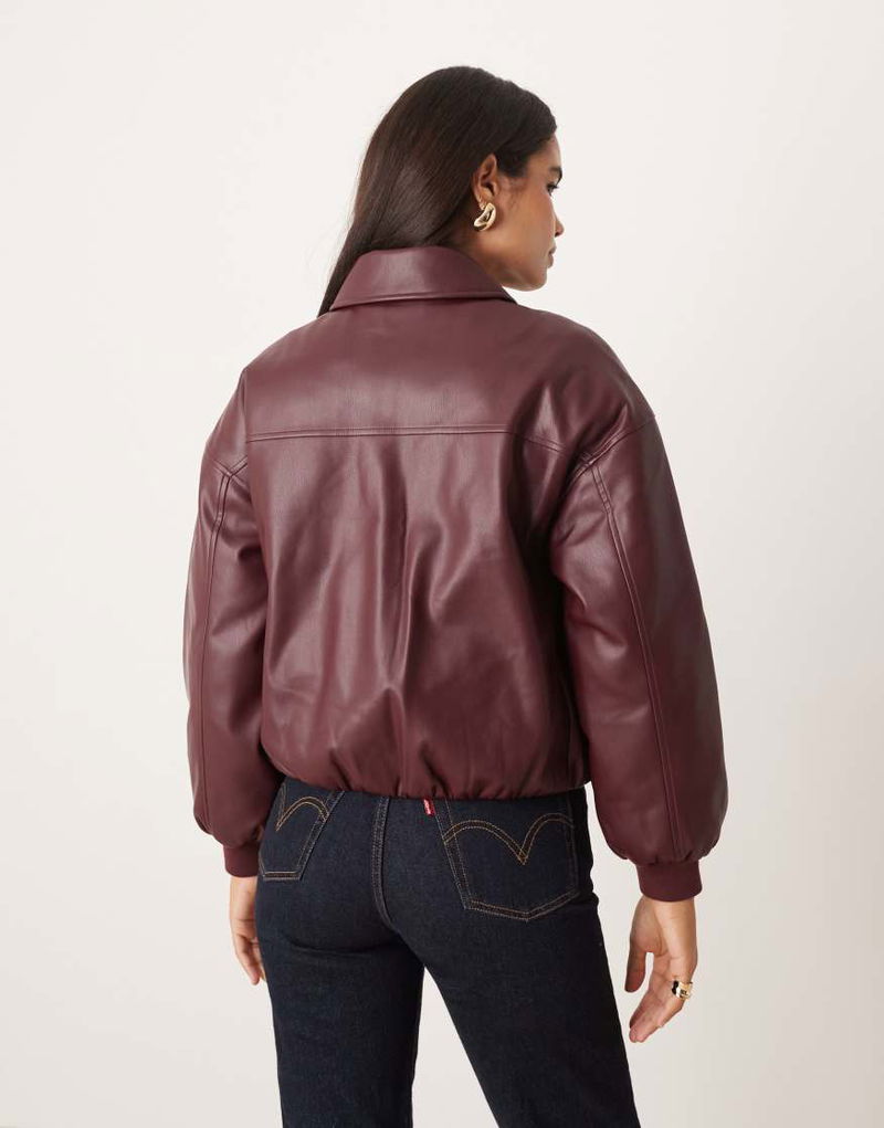 Abercrombie & Fitch Vegan Leather Bubble Hem Bomber Coat In Burgundy