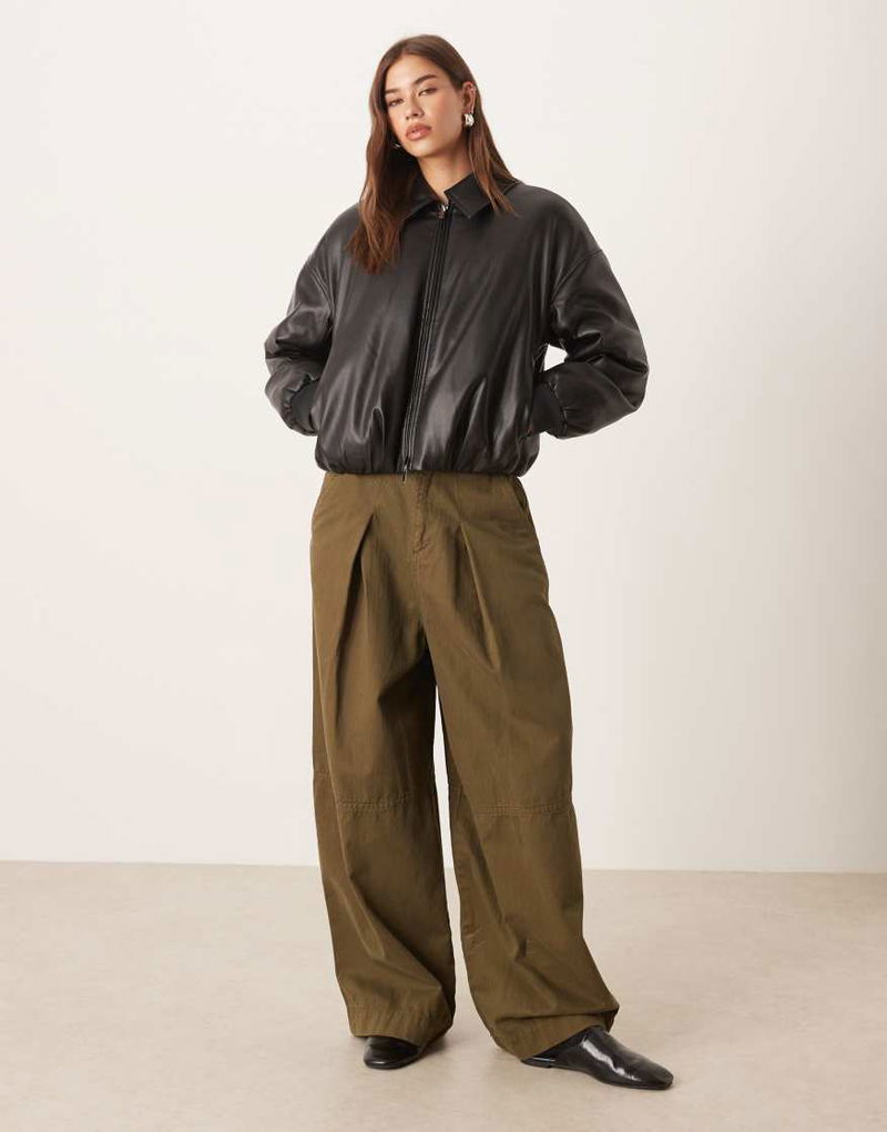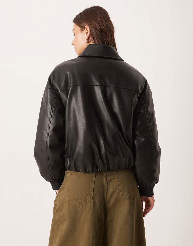 Abercrombie & Fitch Vegan Leather Bubble Hem Bomber Jacket In Black