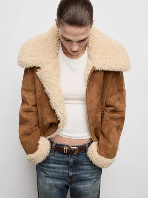 Borg lining. High collar. Buckle strap. Zip fastening. Side pockets. Cropped length.