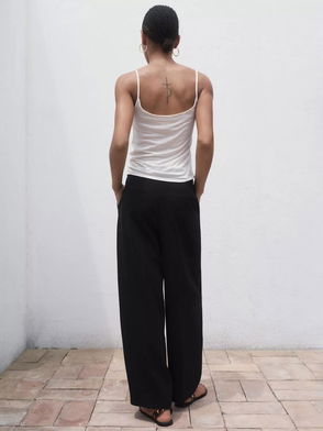 Wardrobe worthy High rise Belt loops Concealed fly Five pockets Barrel leg.