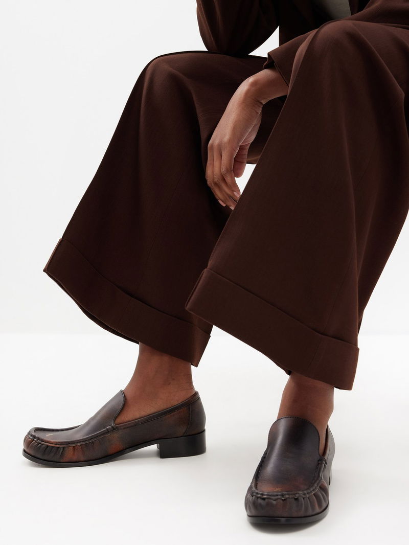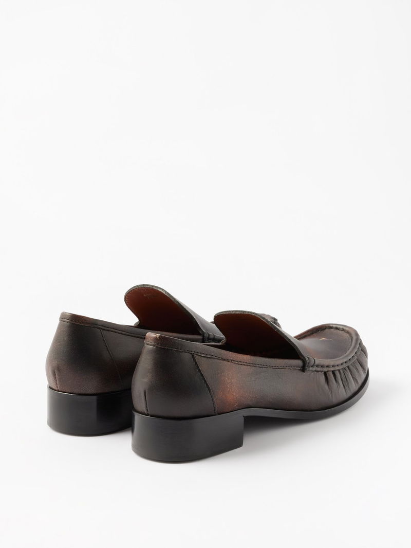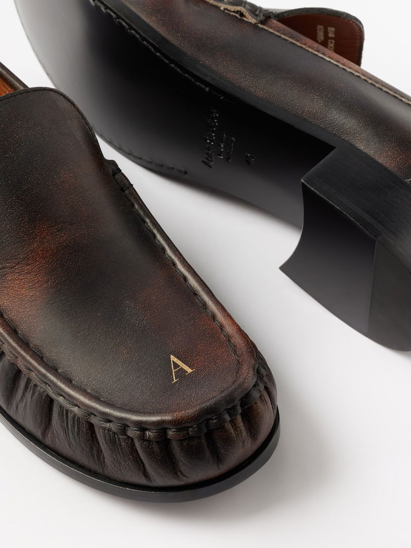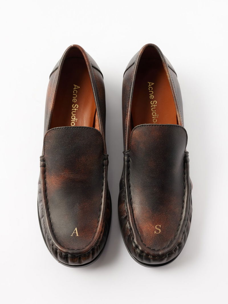 Acne Studios accentuates the texture of the leather chosen for these brown logo-print Babi Due loafers, using a spray painting technique to achieve a rich patina.