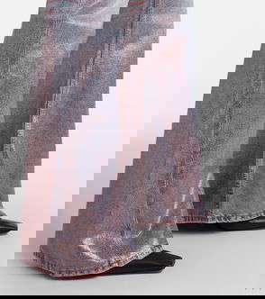 Acne Studios denim jeans. Exposed button and concealed zip-fly fastening at front. Regular fit, high-rise, bootcut leg, structured waistband with belt loops, five pockets, whiskering, branded hardware, ragged and tied effects, branded leather patch at back, mid-tone wash.
