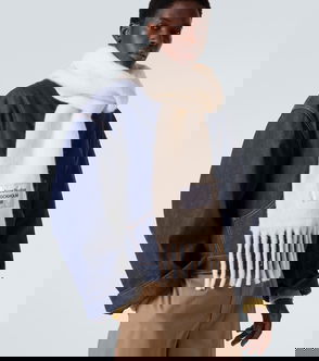 Acne Studios’ white Canada New scarf is shaped to a wide silhouette that will bring a contemporary finish to cold-weather ensembles. It’s made from butter-soft brushed wool twill with the label’s signature pink logo-jacquard tab at the corner and fringed edges.