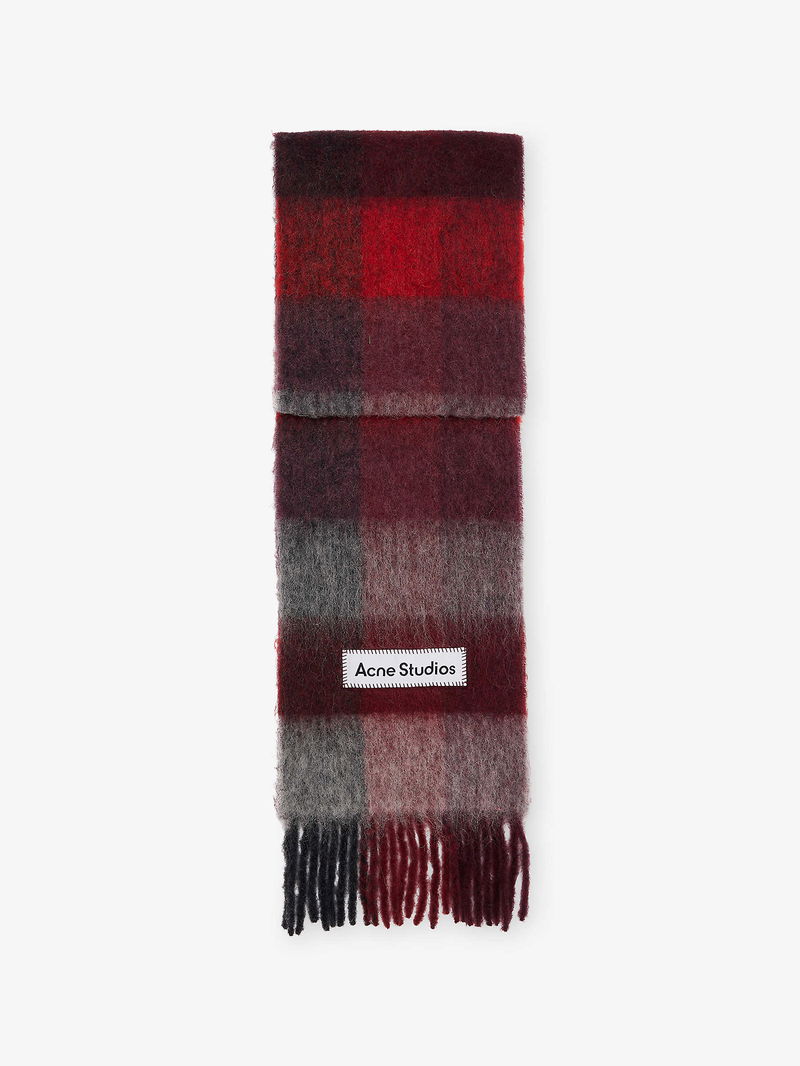 Acne Studios knitted scarf. Logo label at front, check pattern, fluffy texture, fringed edges.