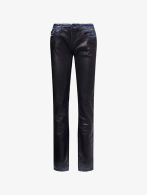 Loose-fit coated non-stretch denim jeans. Fading whiskering throughout.· Low-rise· Detachable pin-buckle belt· Belt loops· Five-pocket styling· Zip-fly· Extended legs· Curved outseams· Leather logo patch at back waistband.