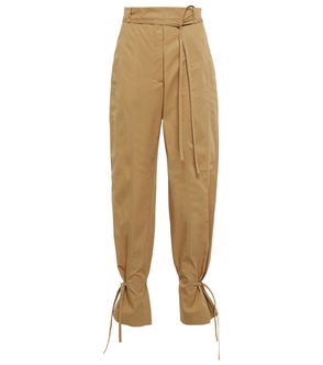 Tapered pants, Cotton, Detachable waist tie, Two side slit pockets, Two back welt pockets, Belt loops, High-rise cut, Tied cuffs, Concealed hook, button and zip fastening at front, Mid-weight, non-stretchy fabric.