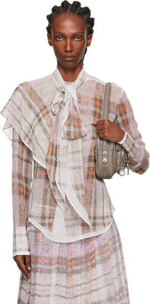Semi-sheer viscose crepe blouse. Trompe-l'œil graphic printed throughout.· Integrated scarf-style trim at round neck· Button closure· Flared cuffs· Self-tie drawstring at back.