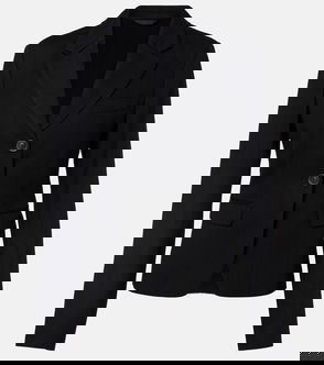 Blazer, Pinstriped, Wool-blend, Cropped, Shoulder pads, Buttoned cuffs, Breast pocket, Button fastening at double-breasted front, Fully lined, Mid-weight, non-stretchy fabric.
