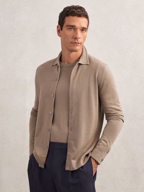 Knit wool cardigan.· Rib knit spread collar, hem, and cuffs· Button closure· Logo embroidered at chest.