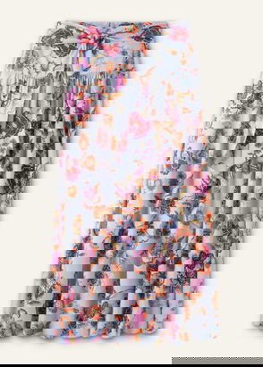 Viscose crepe skirt. Floral pattern printed throughout.· Layered construction· Concealed zip closure at back waist· Fringe detailing at asymmetric hem.