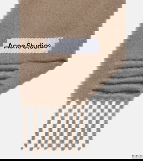 Acne Studios wool-blend scarf. Rectangular shape, brand patch at front, contrast edge, fringed trims.