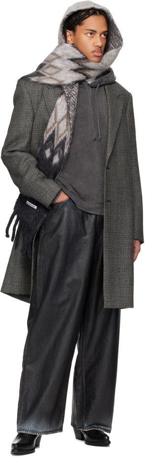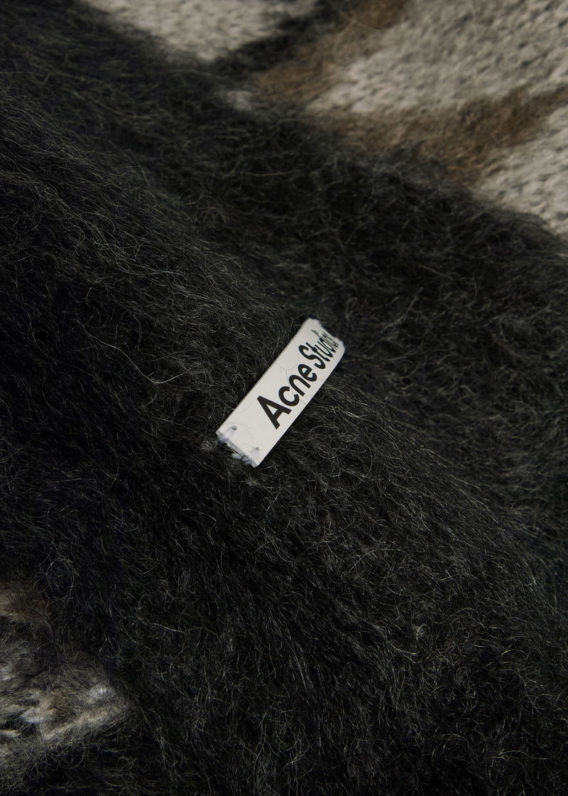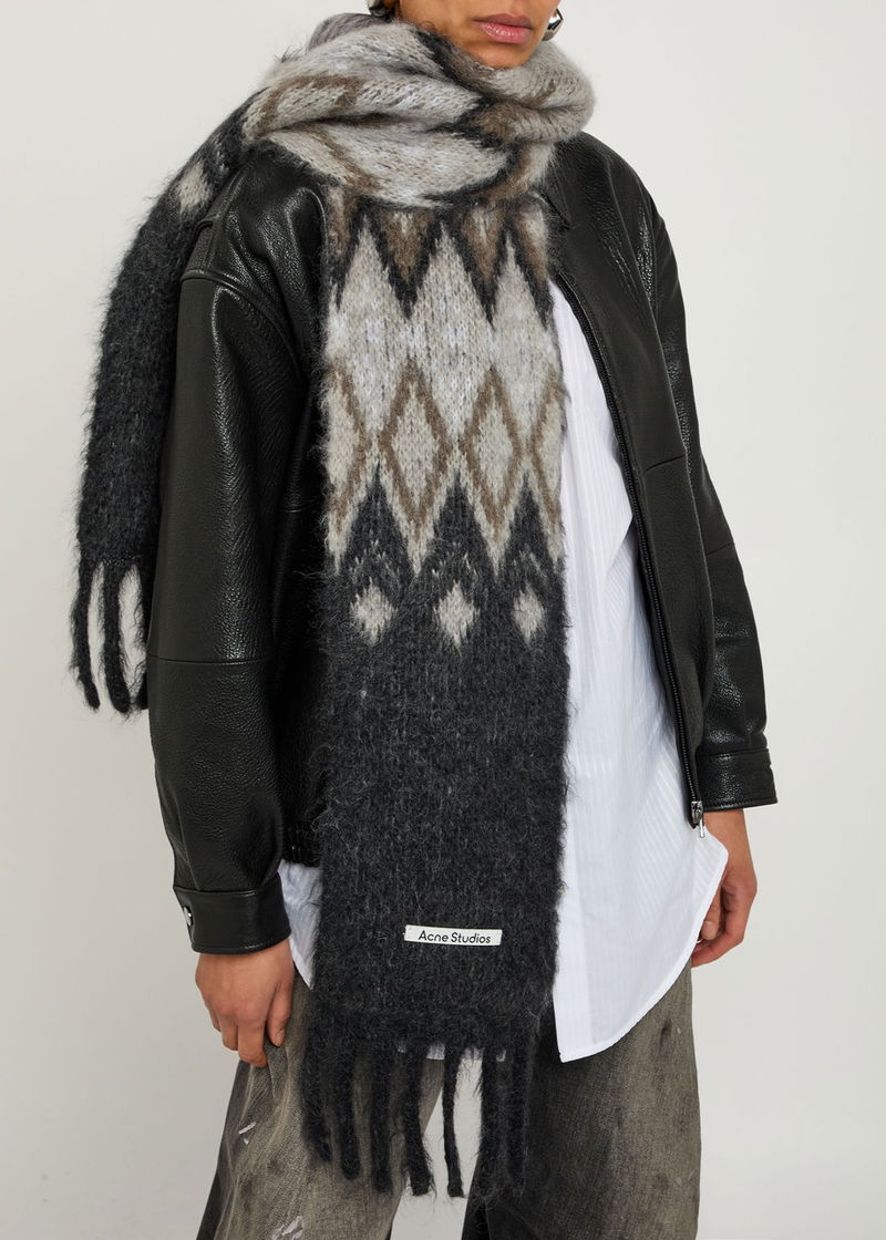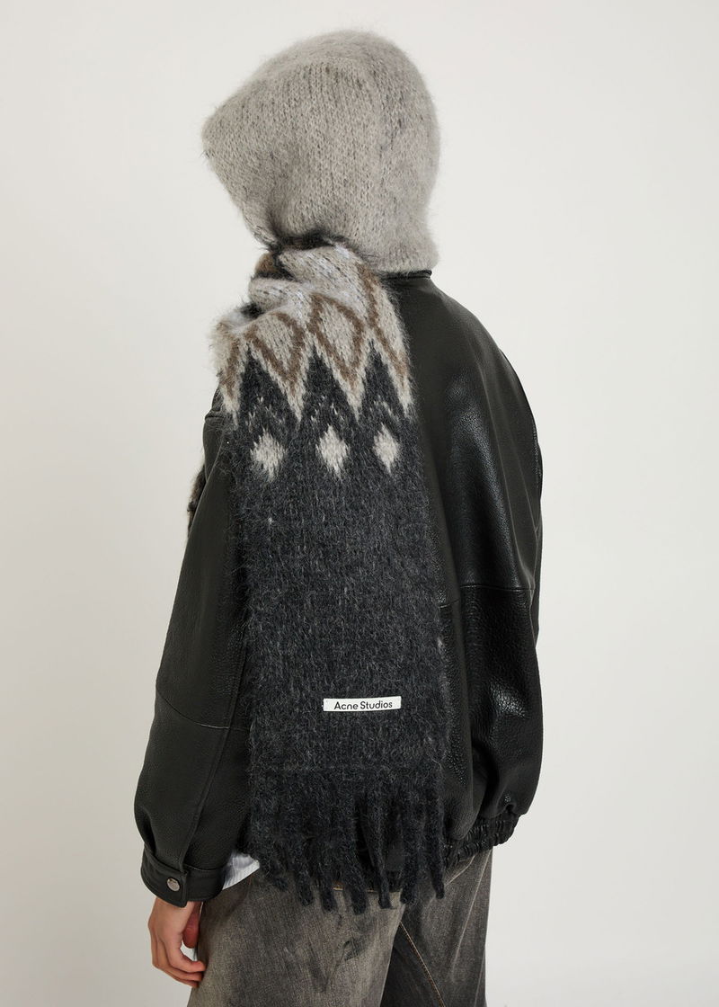Acne Studios brushed mohair-blend scarf. Hood, zigzag intarsia, designer plaque, fringed ends
