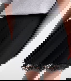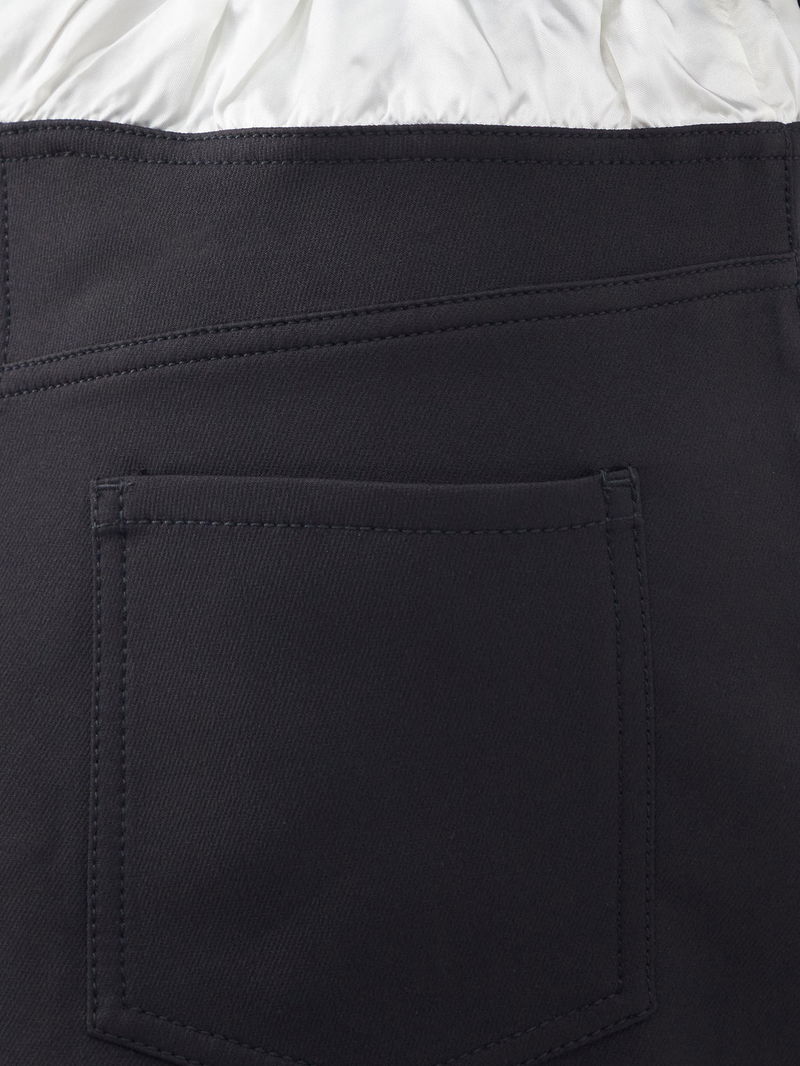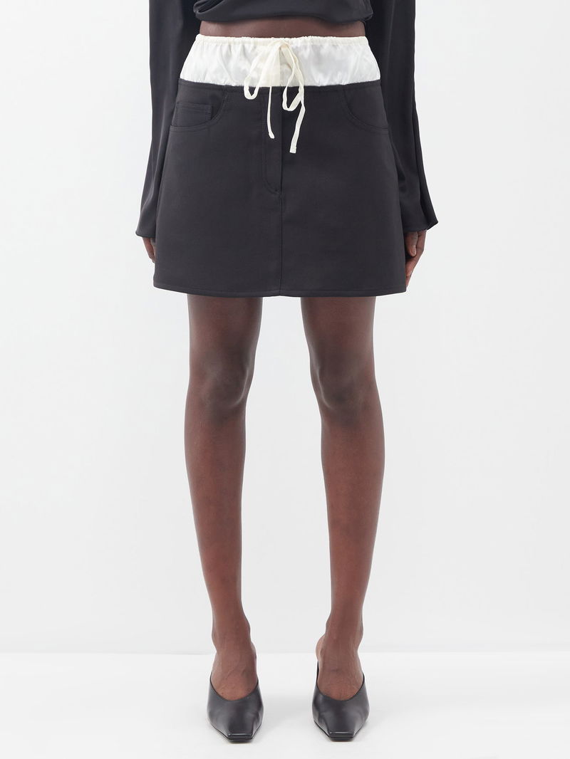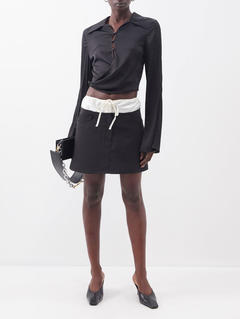 Acne Studios' black Ichia mini skirt is cut from structured technical twill to an A-line shape and framed with a white satin high waist that secures with drawstring ties.