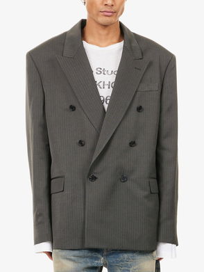 Acne Studios woven blazer. Exposed button fastenings at front. Regular fit, notched lapels, long sleeves, buttoned cuffs, welt pocket at chest, two flap pockets at front, single-breasted, lined, all-over pinstripe.