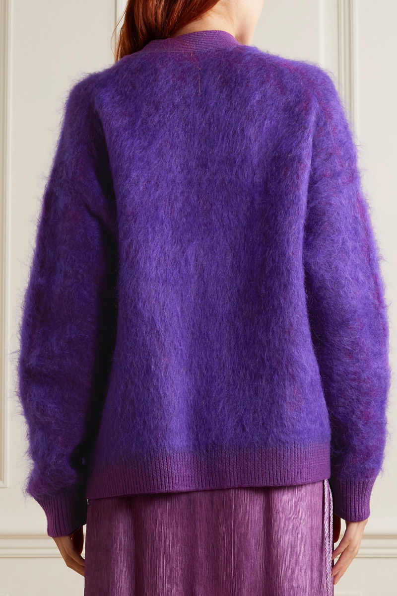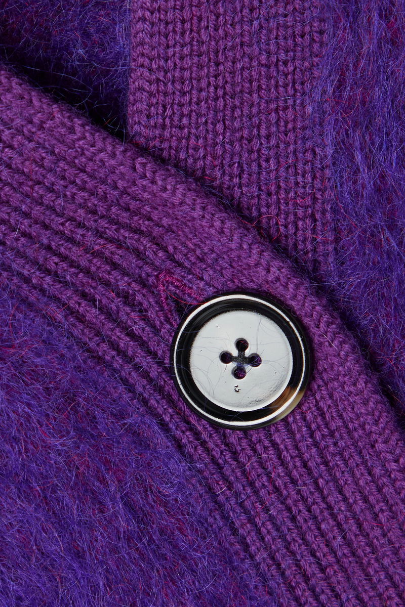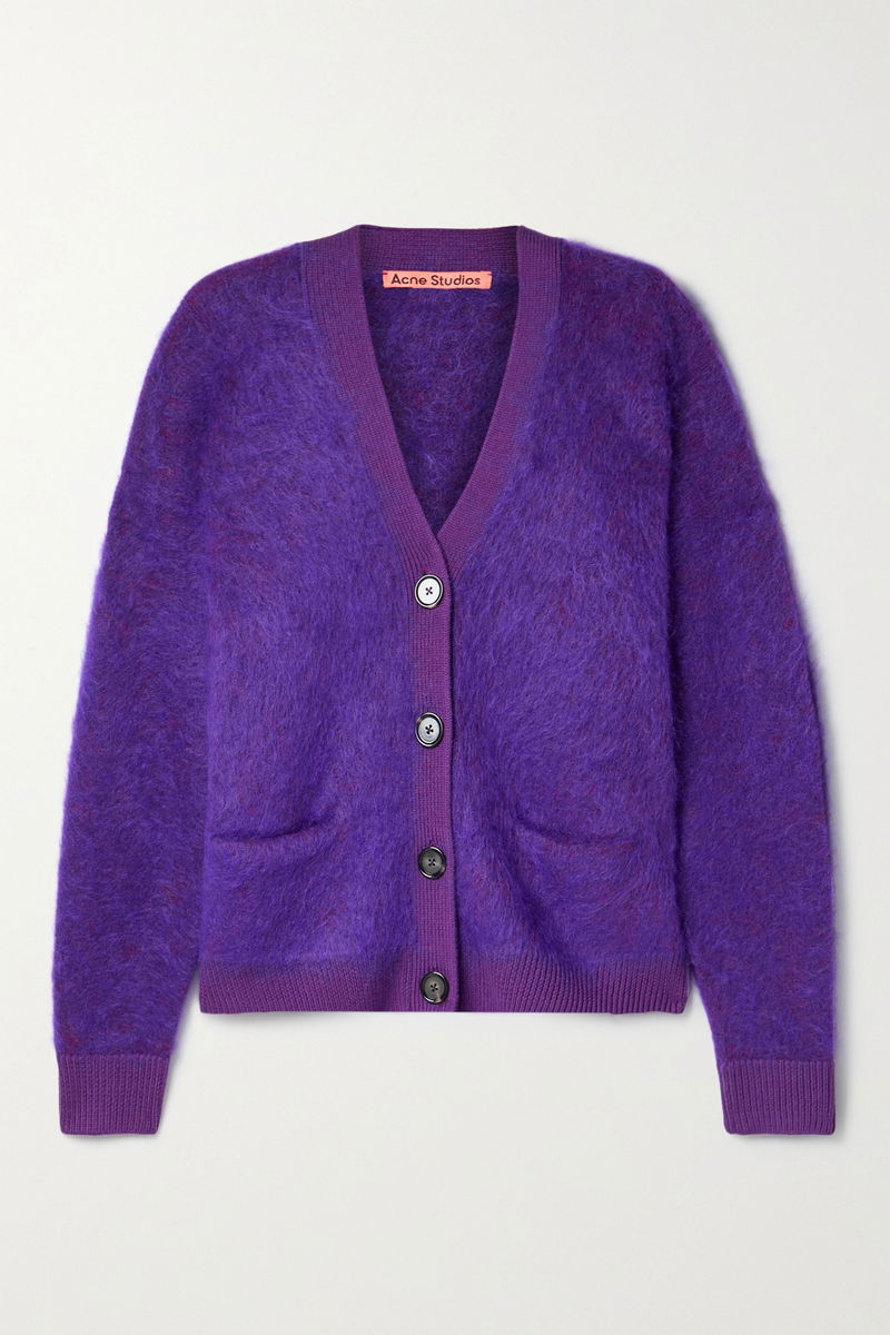 Acne Studios' cardigan is great for layering in colder seasons - it's knitted with touches of mohair and wool that feel so soft and cozy. It has a relaxed fit and fastens with glossy buttons. The tonal-purple palette adds an element of boldness to your outfit.