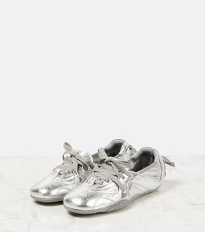 Patent lambskin and grained lambskin flats in brown.· Square toe· Lace-up closure· Logo printed at padded tongue· Elasticized padded collar· Lace-up detailing at heel counter· Grained lambskin lining· Treaded rubber sole.