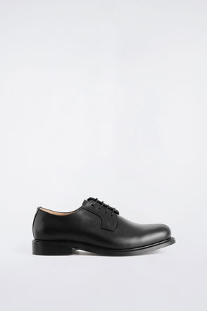 Buffed calfskin derbys in black.· Modified round toe· Lace-up closure· Buffed calfskin lining· Treaded TPU rubber sole.