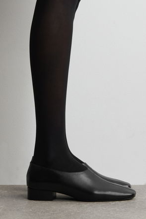Buffed leather slip-on clogs in black. · Central seam at vamp· Buffed lambskin lining· Logo embossed at lambskin footbed· Platform wood midsole· Logo engraved at heel· Textured rubber sole·