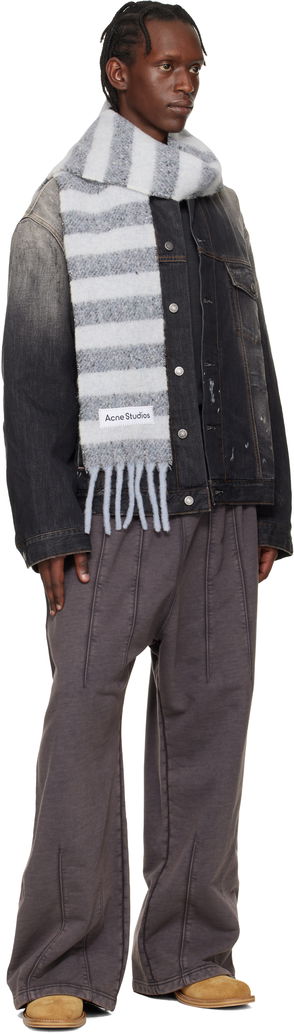 Rectangular brushed alpaca- and wool-blend flannel scarf in black and gray. · Logo patch at face· Fringed detailing at ends·