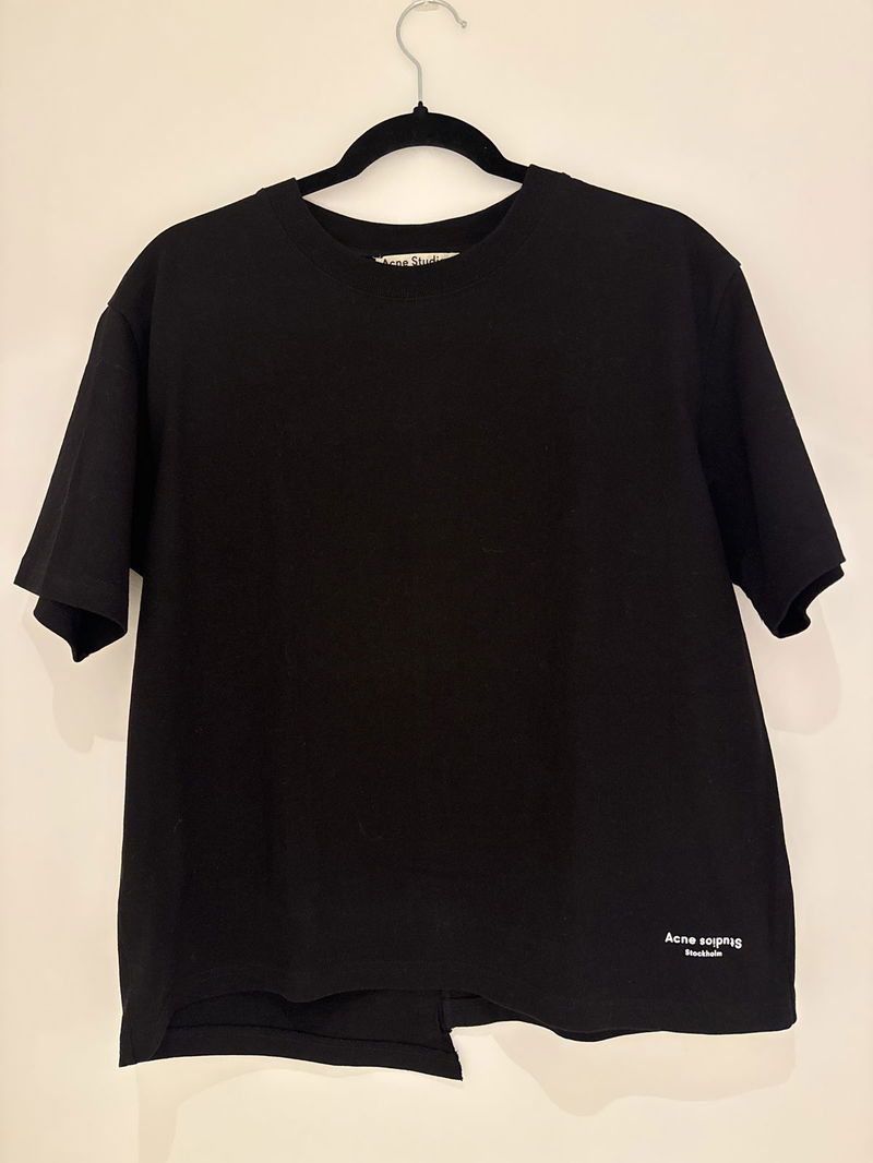 Acne Studios black crewneck, short-sleeve t-shirt crafted from midweight cotton jersey with a irregular hemming. Cut to an oversized fit.