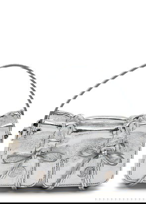 Acne Studios leather top handle bag. Logo-embossed top handle, detachable shoulder strap, designer-engraved hardware, heart hanging charm, ruched details with bow trims, slip pocket at back, two internal card slots, fully lined. Concealed magnetic fastenings at flap front.