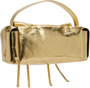 Acne Studios metallic-suede top handle bag. Printed, logo-embossed top handle, detachable shoulder strap, designer-engraved hardware, heart hanging charm, ruched details with bow trims, slip pocket at back, two internal card slots, fully lined. Concealed magnetic fastenings at flap front.