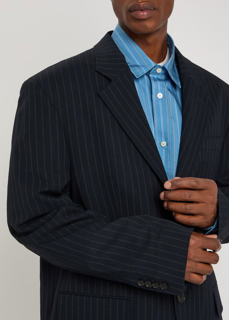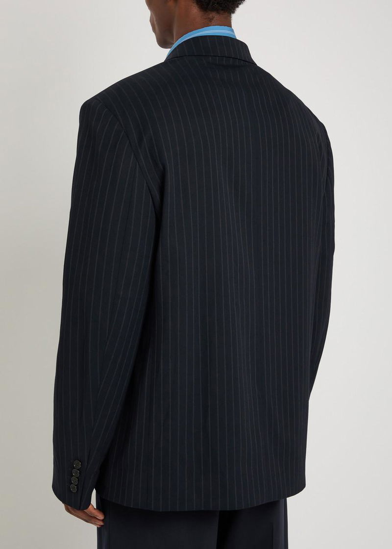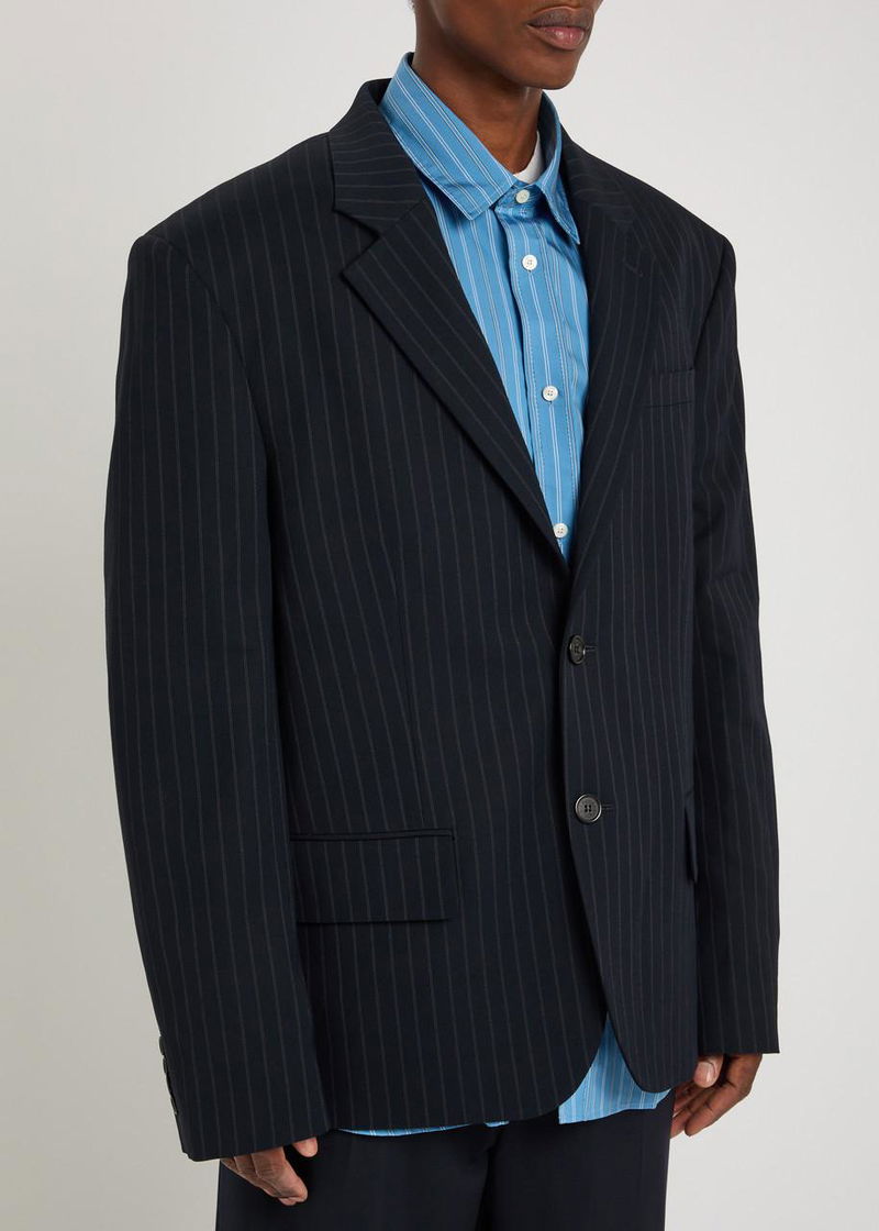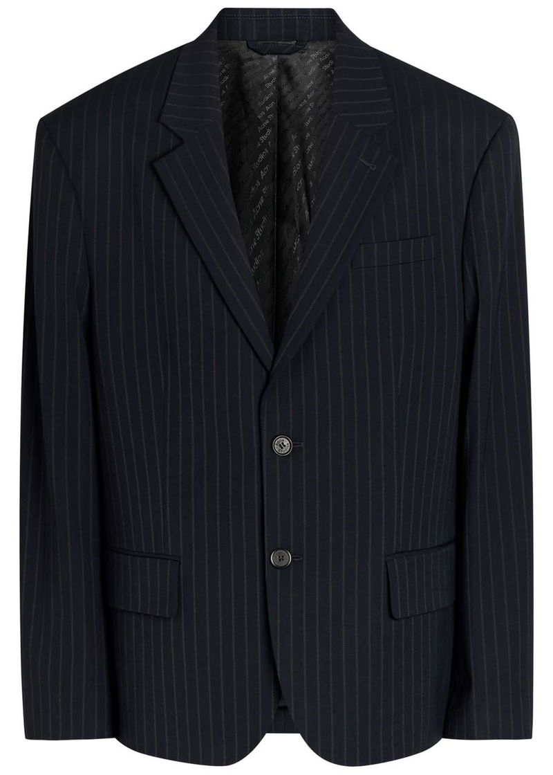 Acne Studios woven blazer. Pinstripe, notched lapels, padded shoulders, button-fastening cuffs, chest slit pocket, front flap pockets, two internal button-fastening pockets, fully lined. Button fastenings at front.