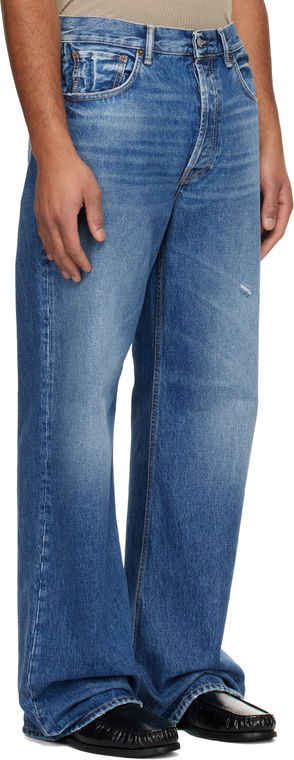 Acne Studios denim jeans. Mid-rise fit, straight-leg cut, belt loops, five pockets, designer plaque at back, ripped and distressed details, washed and faded finish.