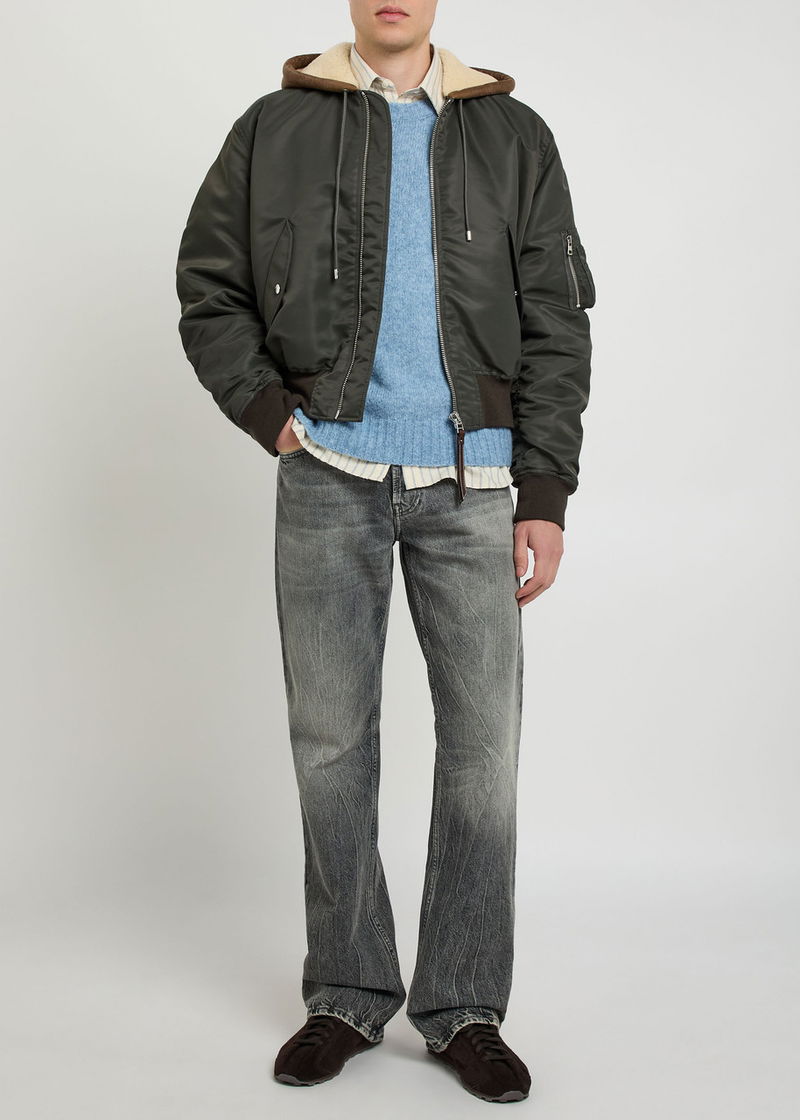 • Mid-rise fit, relaxed straight-leg cut, belt loops, five pockets, designer plaque at back, whiskered and washed finish