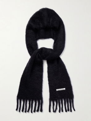 Rectangular brushed knit alpaca- and wool-blend scarf in off-white, blue, and beige.· Logo patch at face· Fringed detailing at ends.