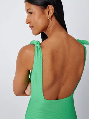 Branded design. Low scoop neck. Open back. Brief cut