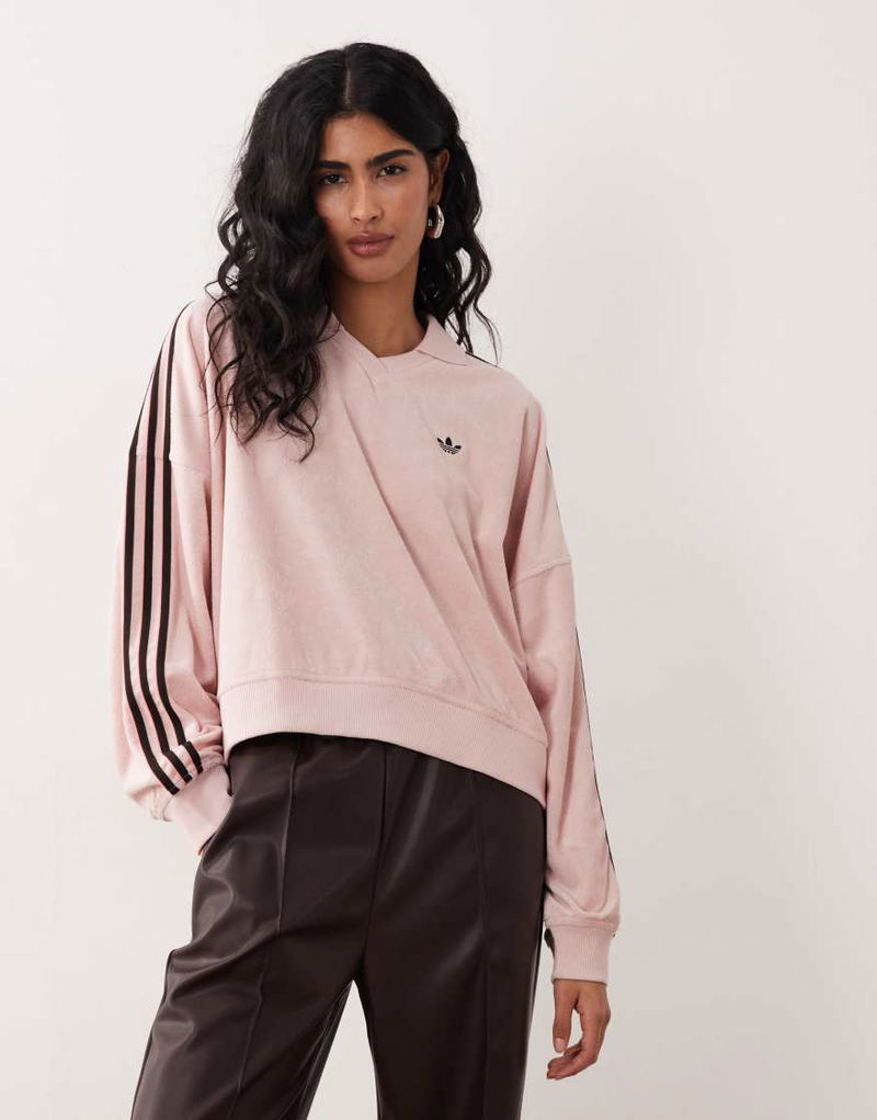 Terry Towel V Neck Long Sleeve Polo Shirt In Pink