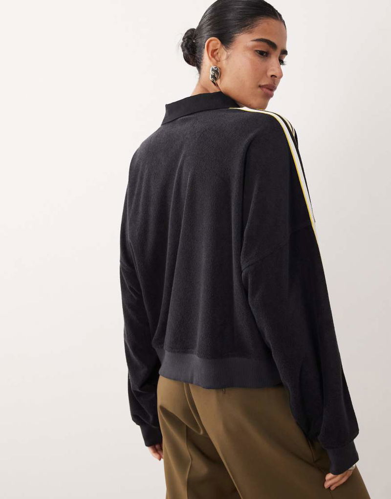 Terry Towel V Neck Long Sleeves Polo Shirt In Black