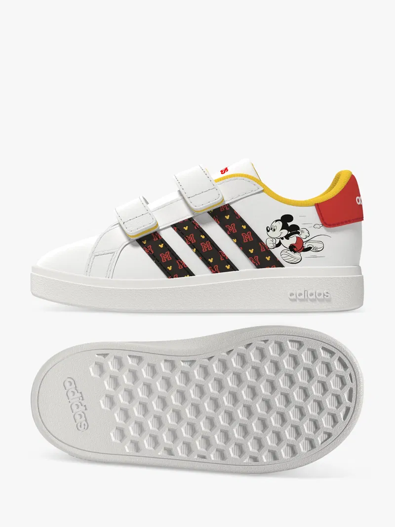 Durable rubber outsole adds years of life onto the design. Your mini-me will soon be outrunning Disney's Mickey in these adidas trainers! They have a smooth upper and cushioned midsole to support growing feet. Hook-and-loop straps are easy for little hands to master, while the Mickey Mouse monogram adds Disney magic to the 3-Stripes.