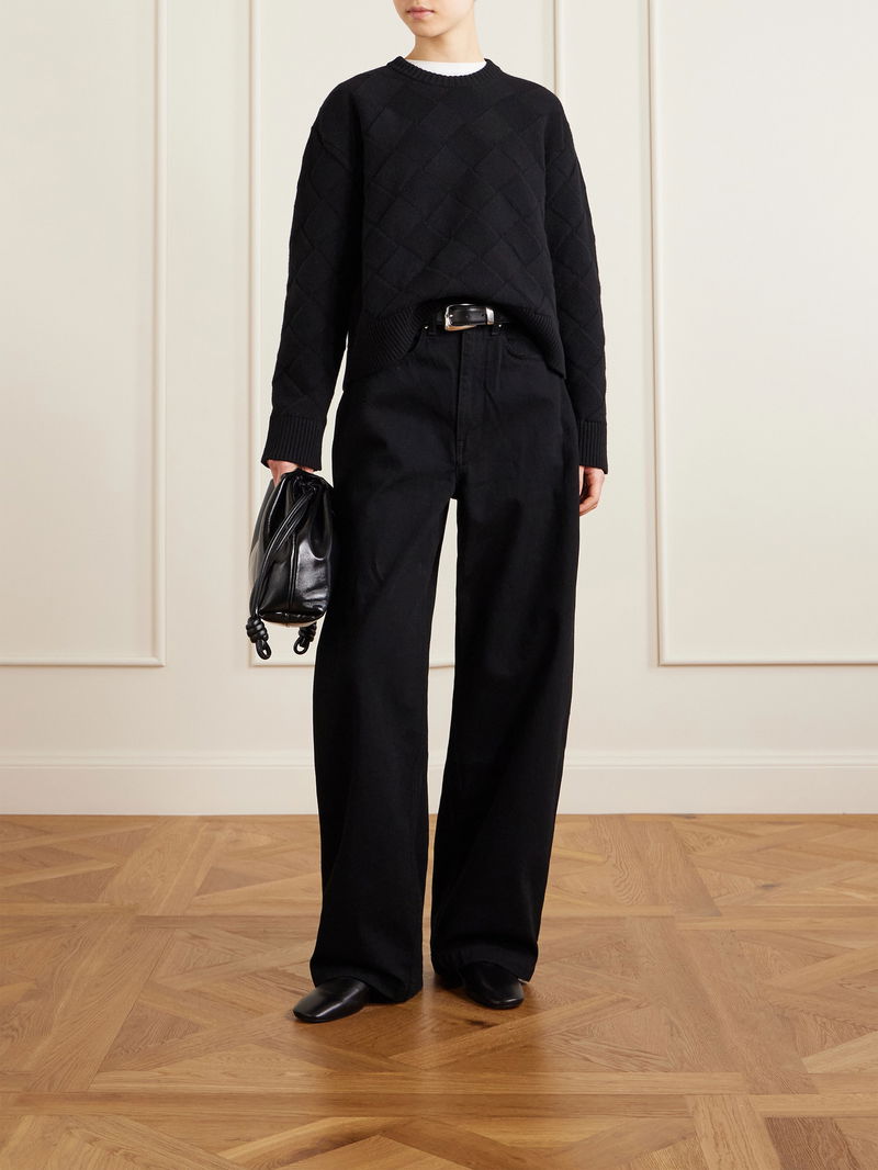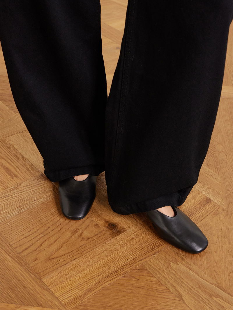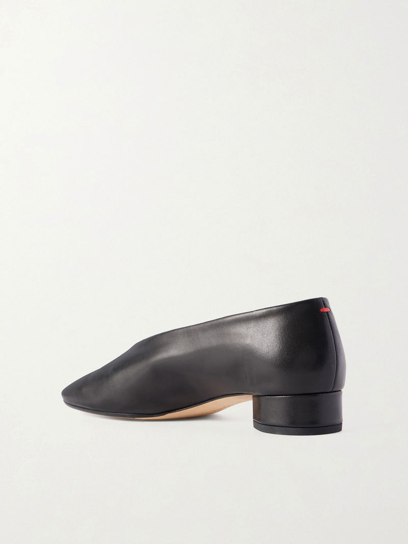 ‘90s minimalism inspires Aeyde’s ‘Delia’ pumps. Handcrafted in Italy from leather, they have high vamps with elongated square toes and rest on low block heels. Style yours with a matching black tote.