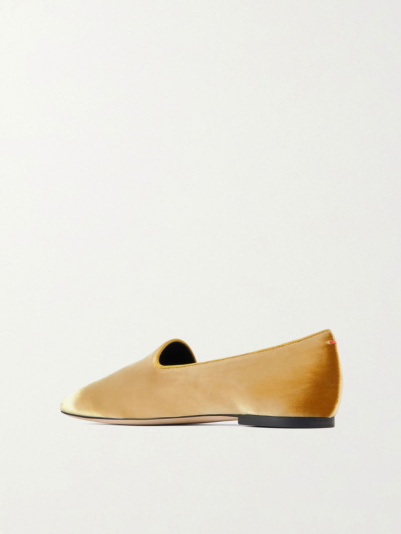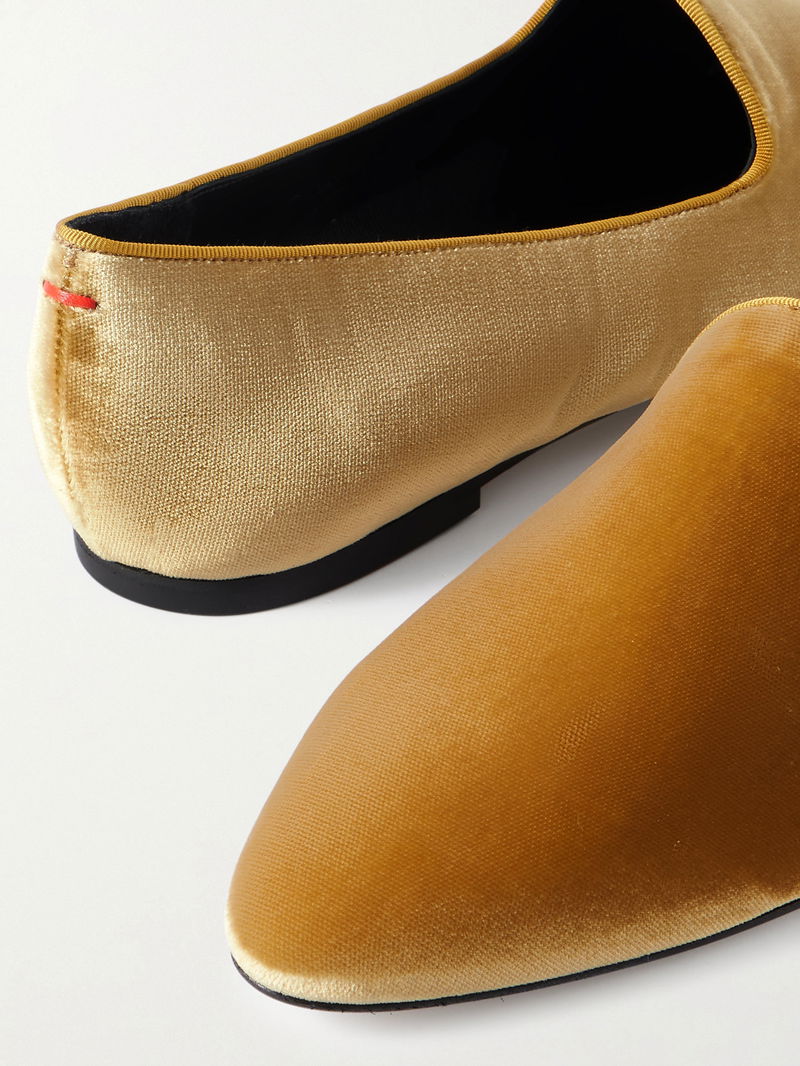 Aeyde's 'Vanna' loafers embody the timeless elegance of Venetian slippers. They've been made in Italy from soft velvet with almond-shaped toes and comfortable cushioned insoles. Highlight the stitches at the back with red socks.