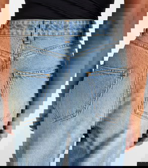 Launched in 2000, AG Jeans brings a modern slant to classic denim styles. This straight-leg style is characterized by oversized roll-up cuffs with raw edges and whiskered bleaching to the mid-rise silhouette.