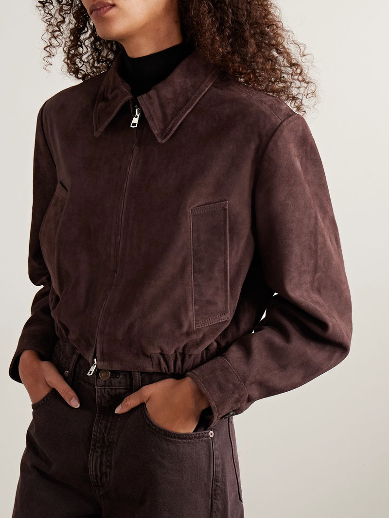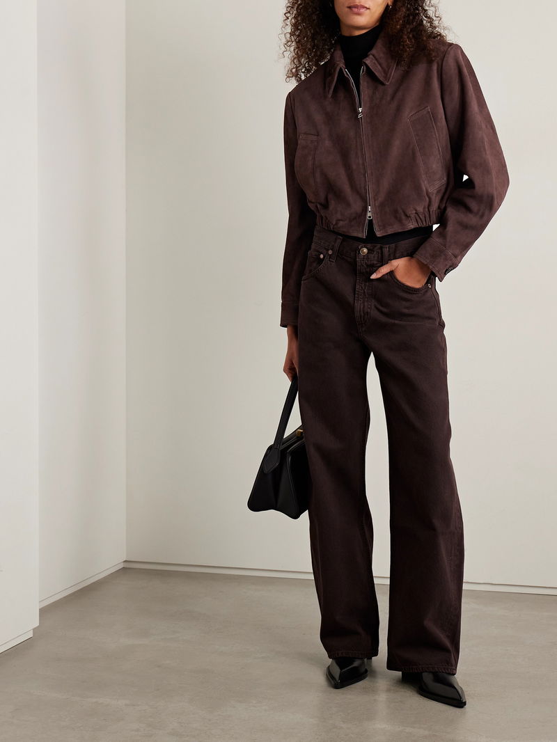 Combining elements of tailoring and bomber styles, AGOLDE's 'Nahla' jacket is designed with padded shoulders balanced by an elasticated hem. It's made from velvety suede in a rich brown suede called 'Root', which will complement so many outfits. The satin lining ensures easy layering.